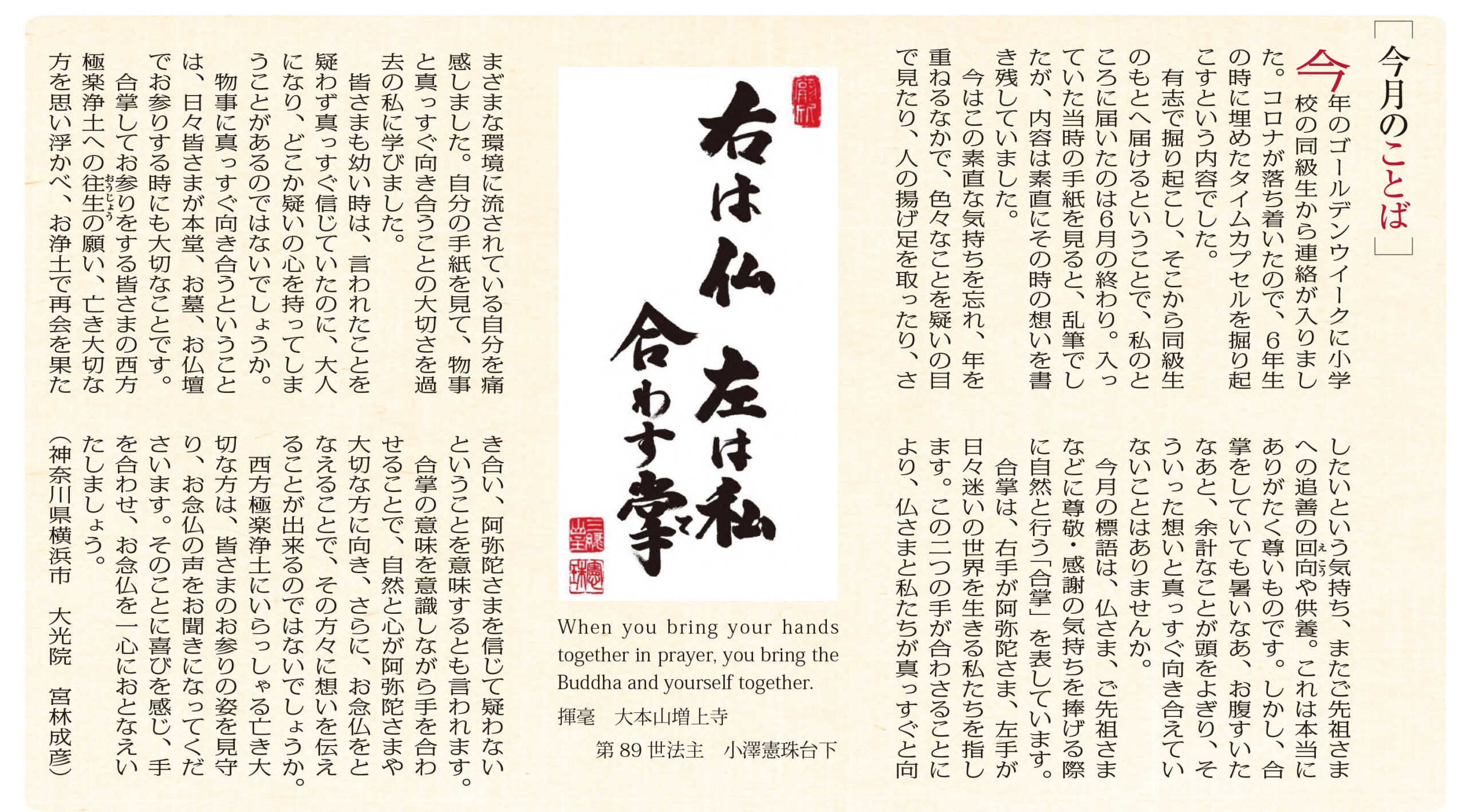 今月の標語は、仏さま、ご先祖さまなどに尊敬・感謝の気持ちを捧げる際に自然と行う「合掌」を表しています。