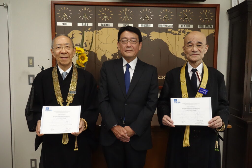 4月にパリで開催された、ユネスコ(国際連合教育科学文化機関)の執行委員会で、「世界の記憶」に「増上寺が所蔵する三種の仏教聖典叢書(増上寺三大蔵)」が国際登録されたことを証明する登録証が、7月29日、申請者の大本山増上寺(東京都港区=小林正道執事長・写真左)と浄土宗(川中光敎宗務総長・写真右)に北山浩士日本ユネスコ国内委員会事務総長(写真中央)から贈られた。 -