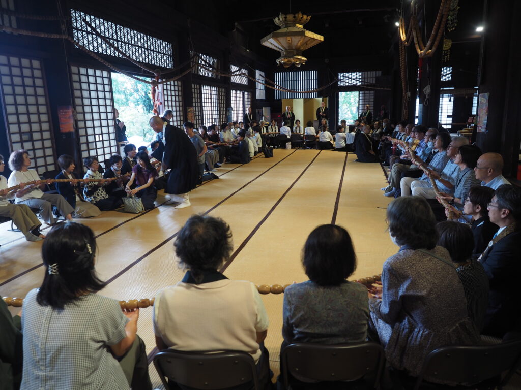 福原台下を導師に13時より営まれた法要には、僧侶・檀信徒ら約130名が参列。堂内には参列者のお念仏の声が響くとともに、平和への深い誓いが刻まれた。