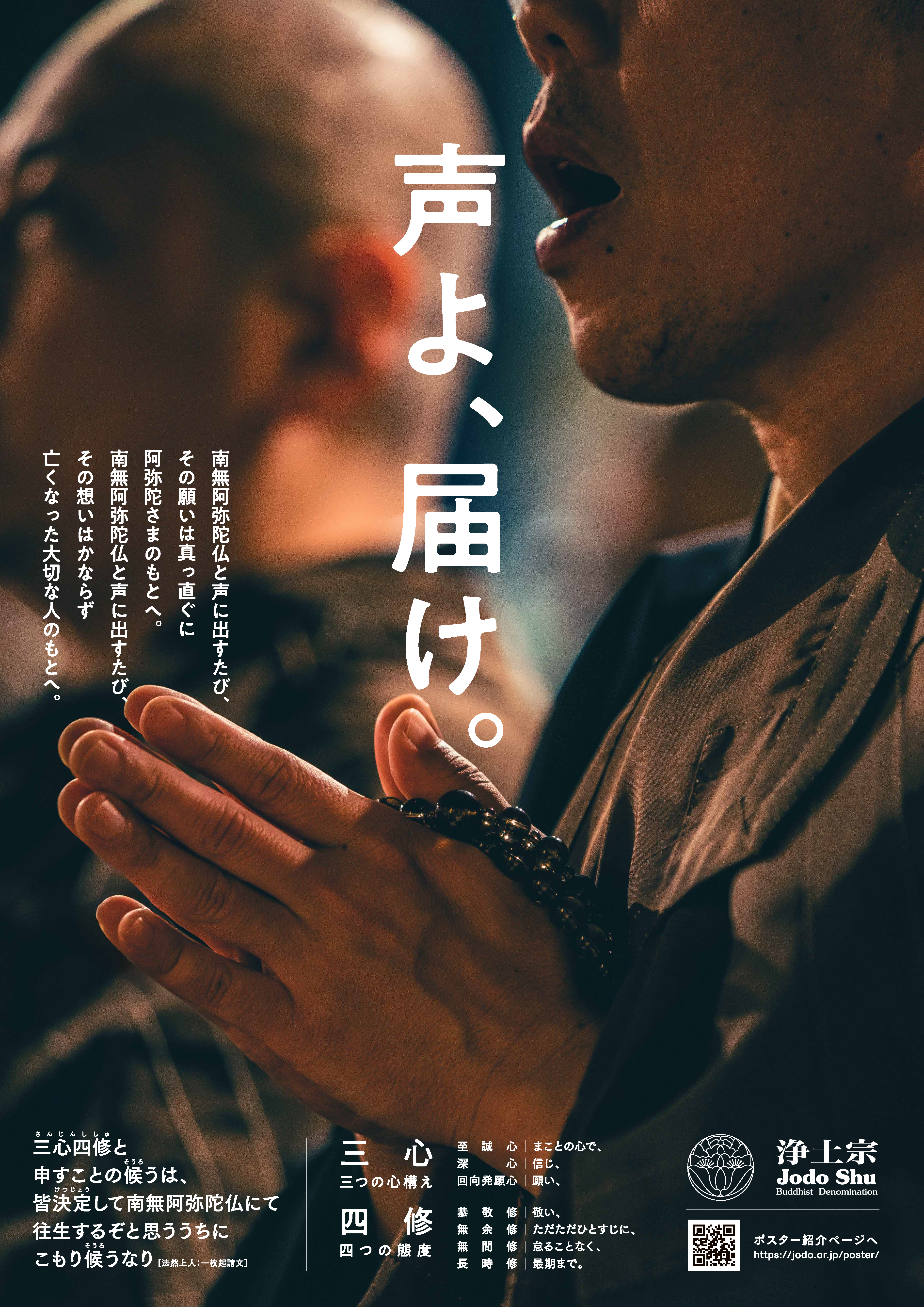 今回のポスターでは「念仏する人」に焦点を当て、「声よ、届け。」のコピーと共に直接的に「念仏する人」の姿を描写し、その「信じ願う」心の姿を表現しようとするものです。ポスターを目にする方の中には毎日お念仏を称える方も、しばらく忘れていたという方も、まったく称えたこともない方もあるでしょう。念仏の「念」は「今の心」。日々欠かさず「今の心」で南無阿弥陀仏と称えることが何より大事です。