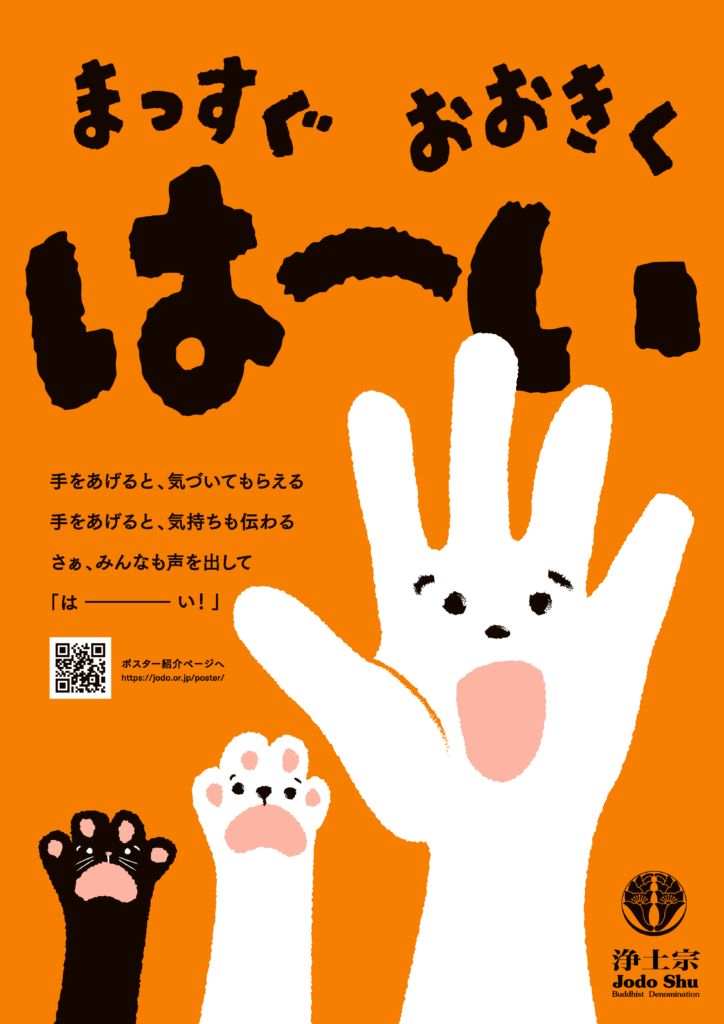 この度のポスターでは「自主性の勧奨」に焦点を当てています。自ら「はーい」と手をあげねば誰も気づきません。子ども達へ主体的な行動を促すのみでなく、人だけでなく犬や猫の手も登場することで、「生きとし生ける」すべての存在にも目を向ける「優しさ」のきっかけとなることを期待しています。